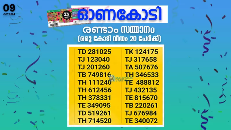 തിരുവോണം ബംബർ രണ്ടാം സമ്മാനം ഒരു കോടി വീതം 20 പേർക്ക്