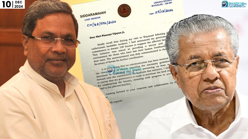 വയനാട് പുനരധിവാസം; 100 വീടുകള് വച്ചുനല്കാമെന്ന വാഗ്ദാനത്തിന് മറുപടി കിട്ടിയില്ല; കേരള മുഖ്യമന്ത്രിക്ക് സിദ്ധരാമയ്യയുടെ കത്ത്